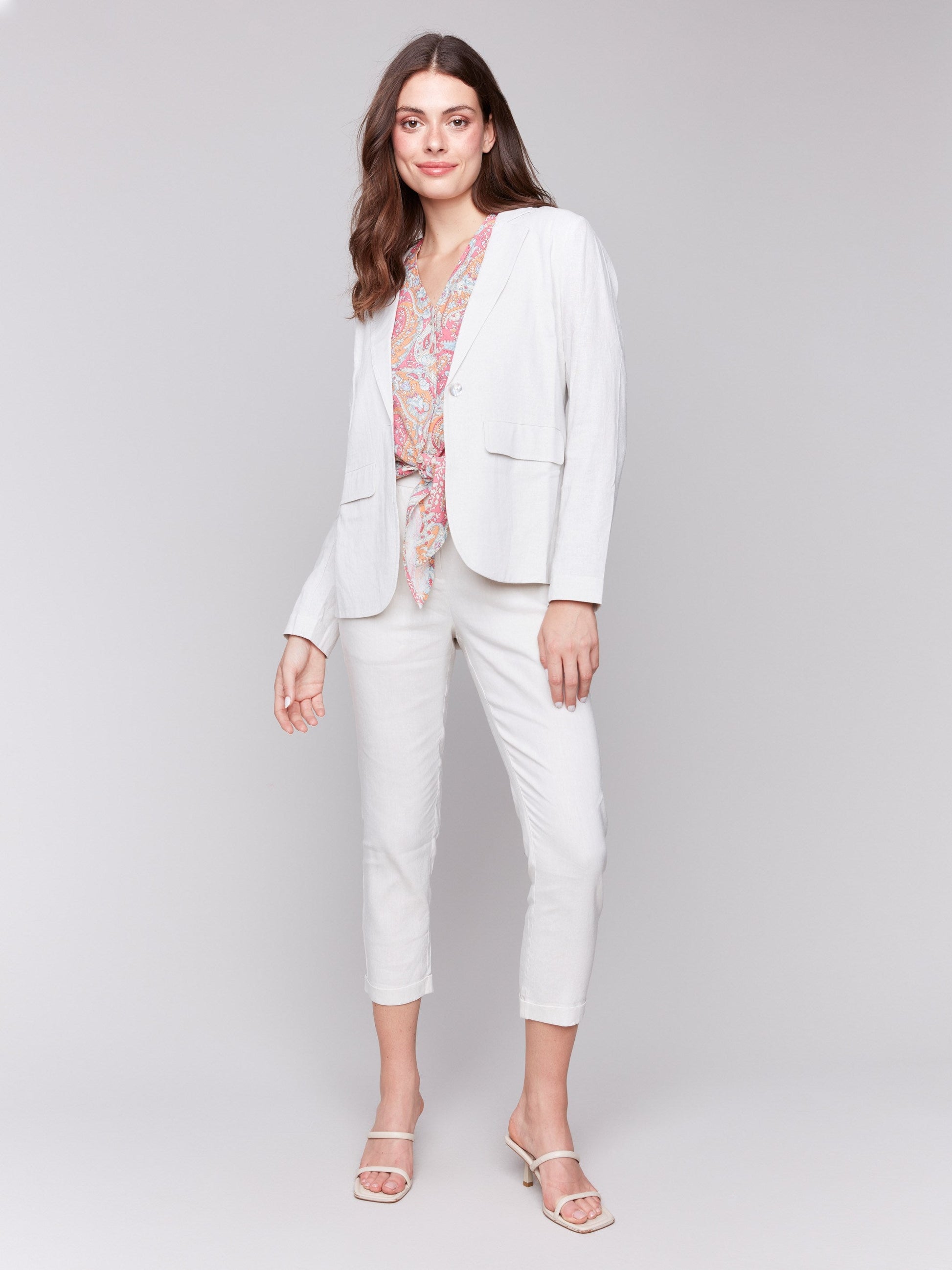 Step into style and sophistication with this linen blend blazer in natural white. Crafted to be lightweight and breathable. it's perfect for staying cool while looking effortlessly chic this spring. The single-button closure lends a sleek. modern touch. and the soft fabric becomes increasingly comfortable with every wear. Elevate any outfit with this essential wardrobe piece!