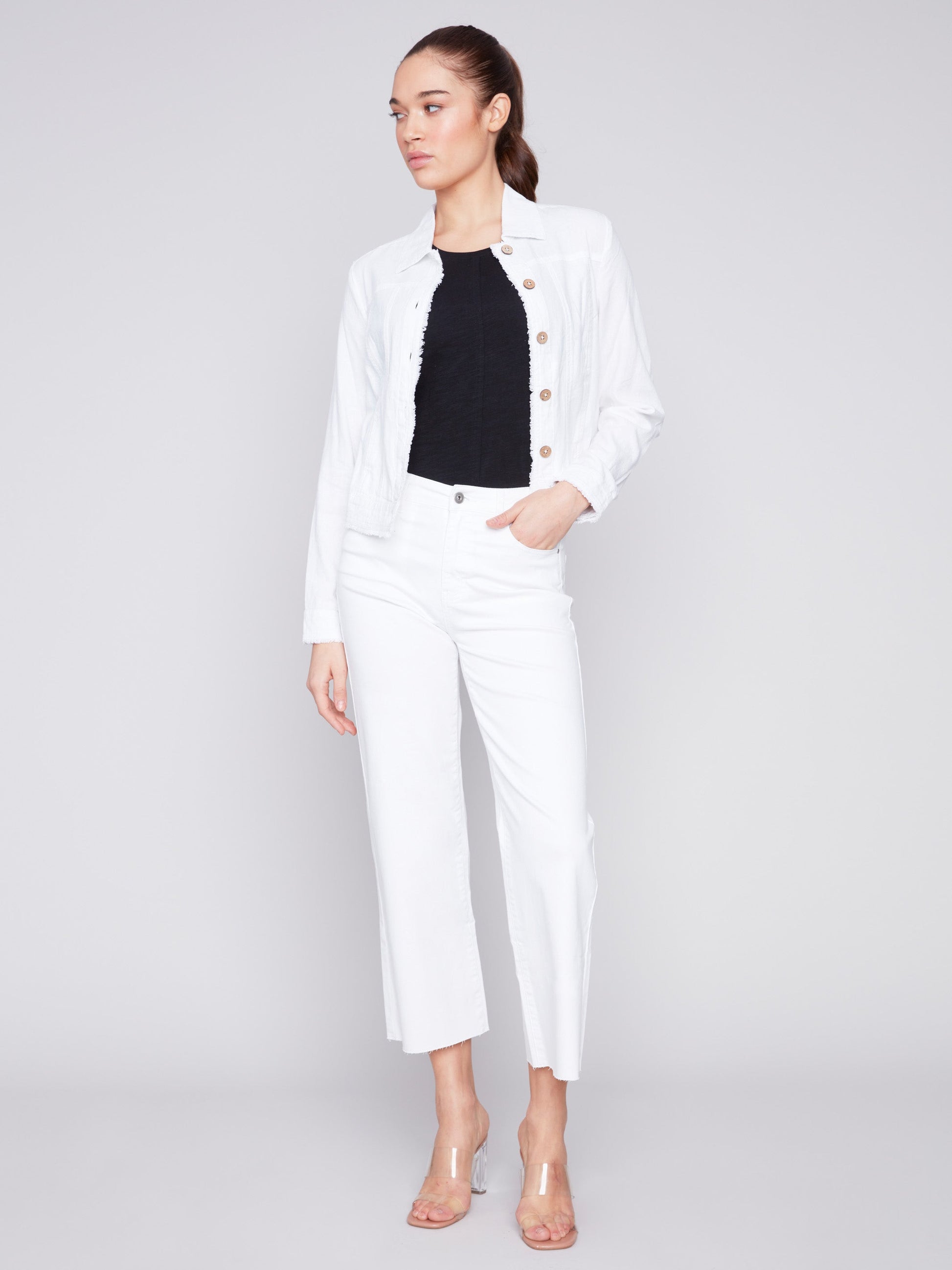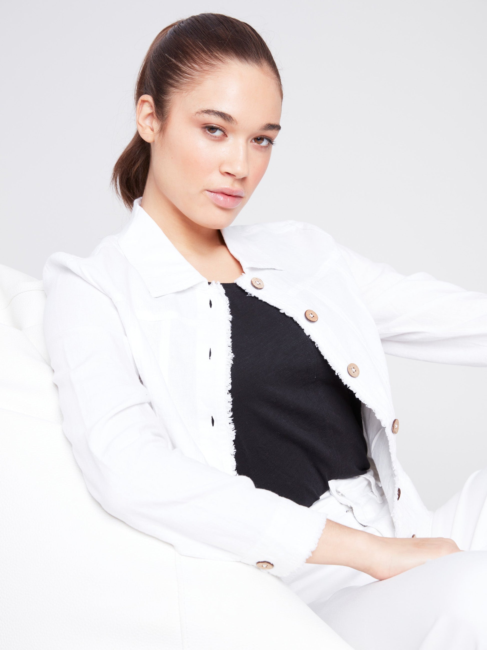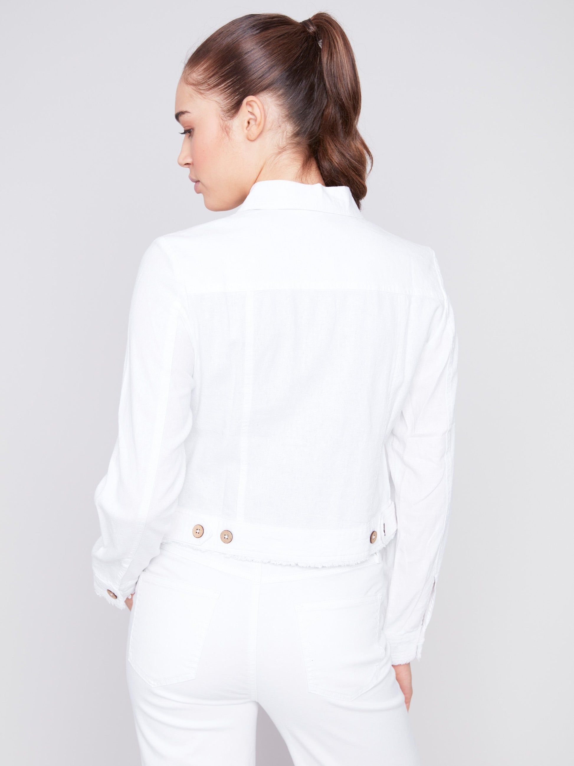 Express your personal style with this linen blend jacket in crisp white. a flexible piece for your wardrobe. The frayed edges and the buttons closure give a touch of relaxed elegance. Wear it with slim jeans or your favorite dress for an easygoing chic appearance all spring and summer.