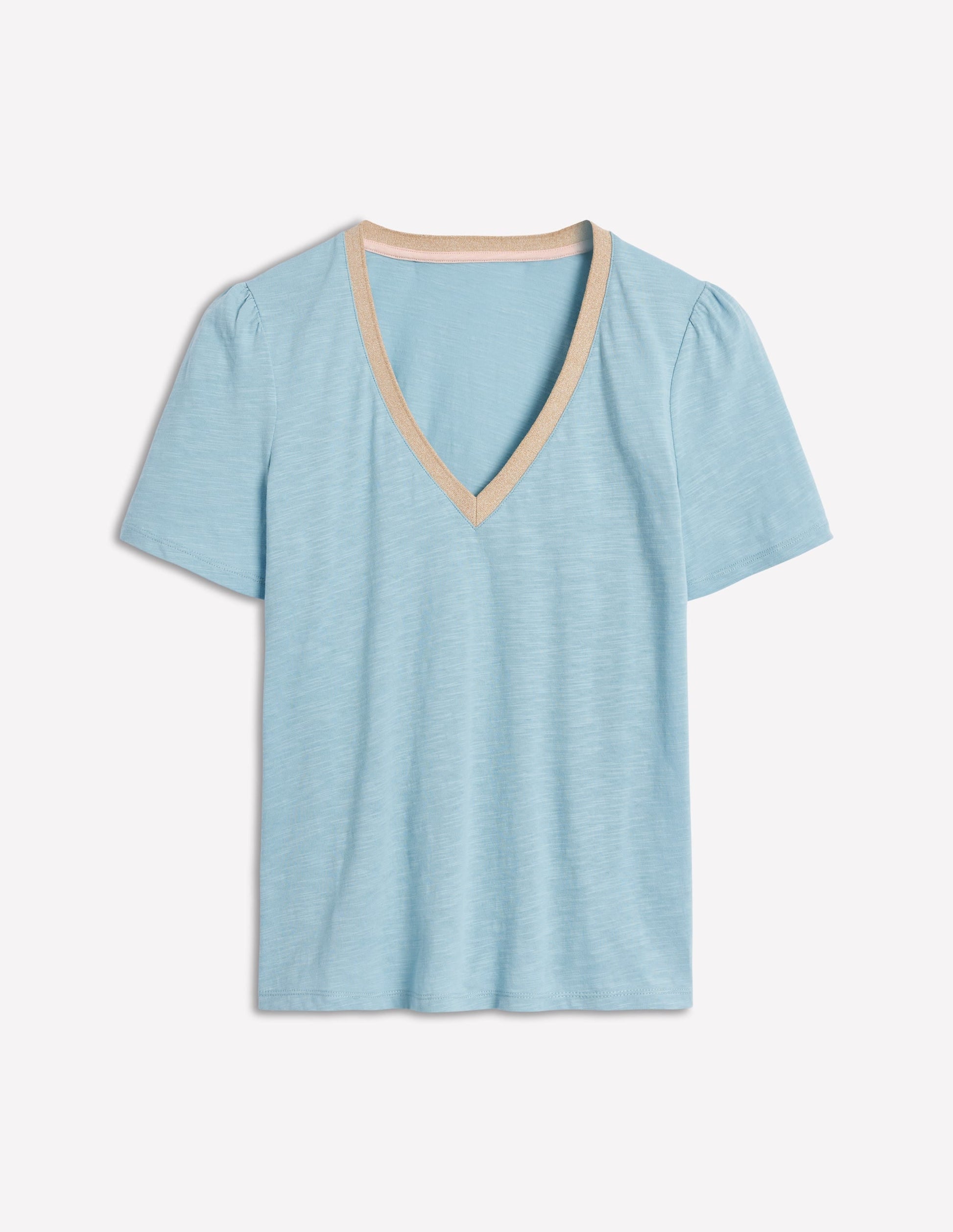 Basics needn't be. well. basic as far as we're concerned. We've dolled this simple t-shirt up with a jazzy metallic trim around the neckline.
