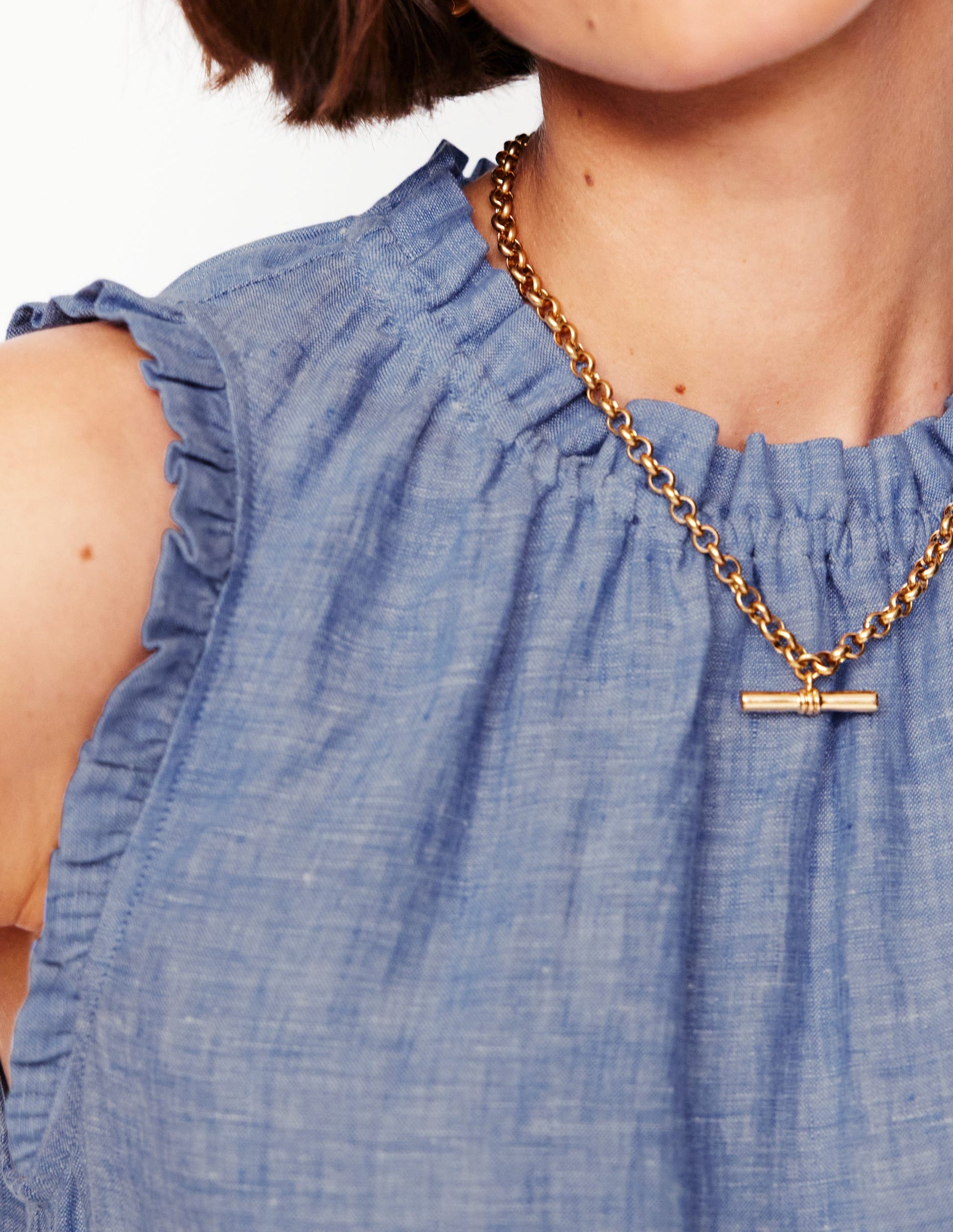 Our Sophie top is floaty and spun from cool. breathable linen. We've added ruffles at the shoulders and neck. too.