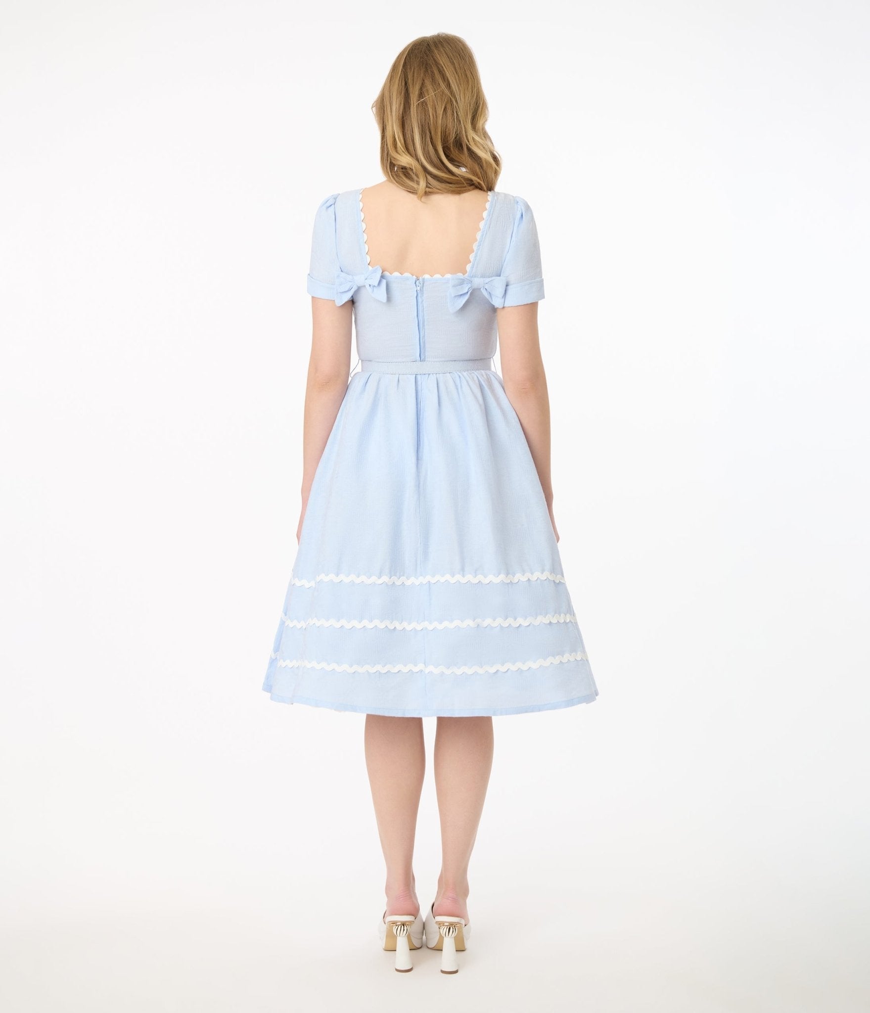 This beautifully 1950s woven dress showcases a vibrant light blue hue that will make you feel like a breath of fresh air. The delicate white ric rac detailing adds an extra touch of elegance. while the included light blue belt cinches your waist for a flattering silhouette. You'll love the sweet surprise of white faux bows on the back. adding a playful twist to your look. The scoop neck and convenient back zipper ensure comfort without sacrificing style.
