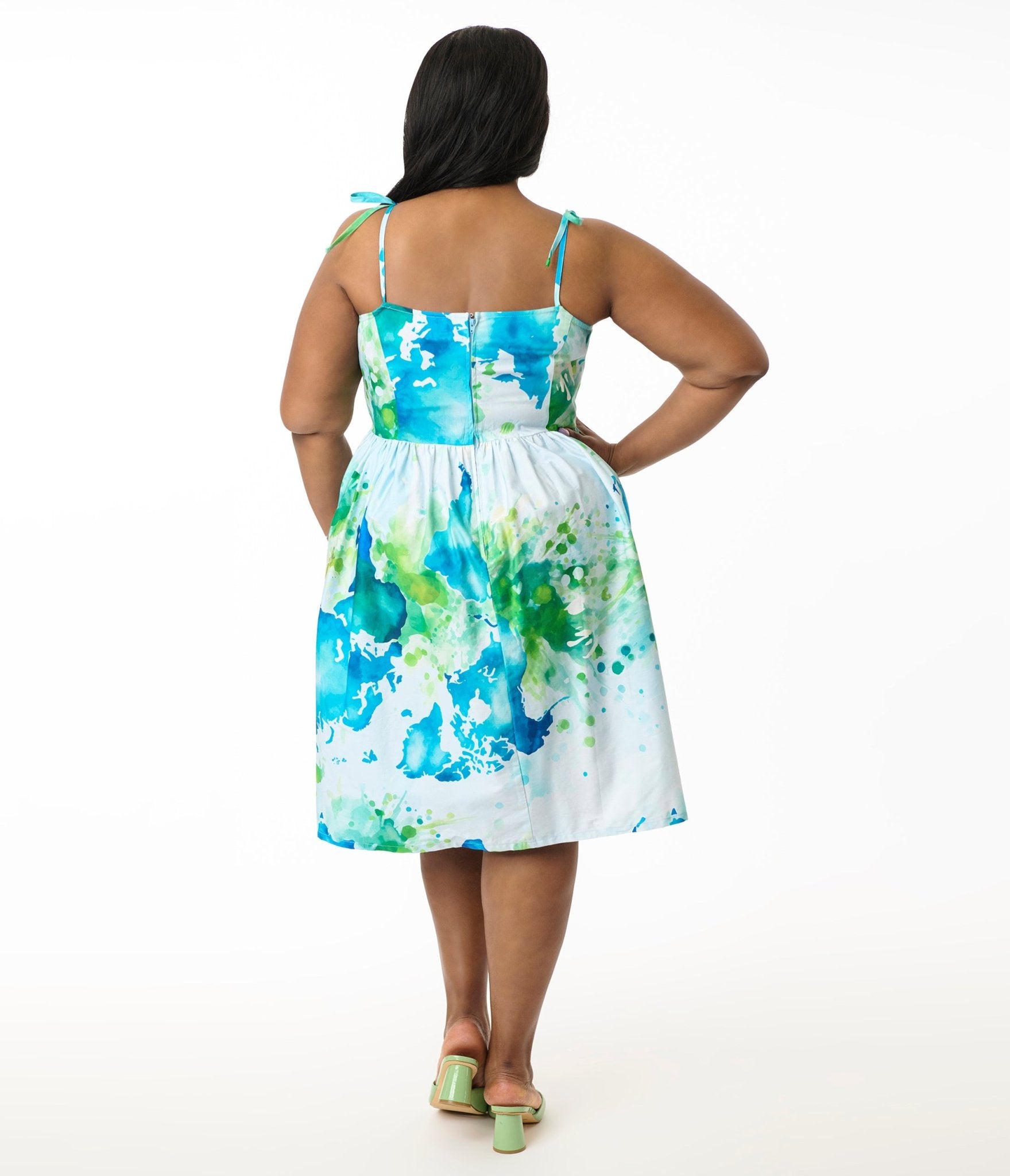 This charming 1950s style swing dress is crafted in white cotton and features a blue and green earth map throughout. Outfitted with a princess seamed bodice and secured by dual spaghetti straps. Complete with side pockets and a back zipper.