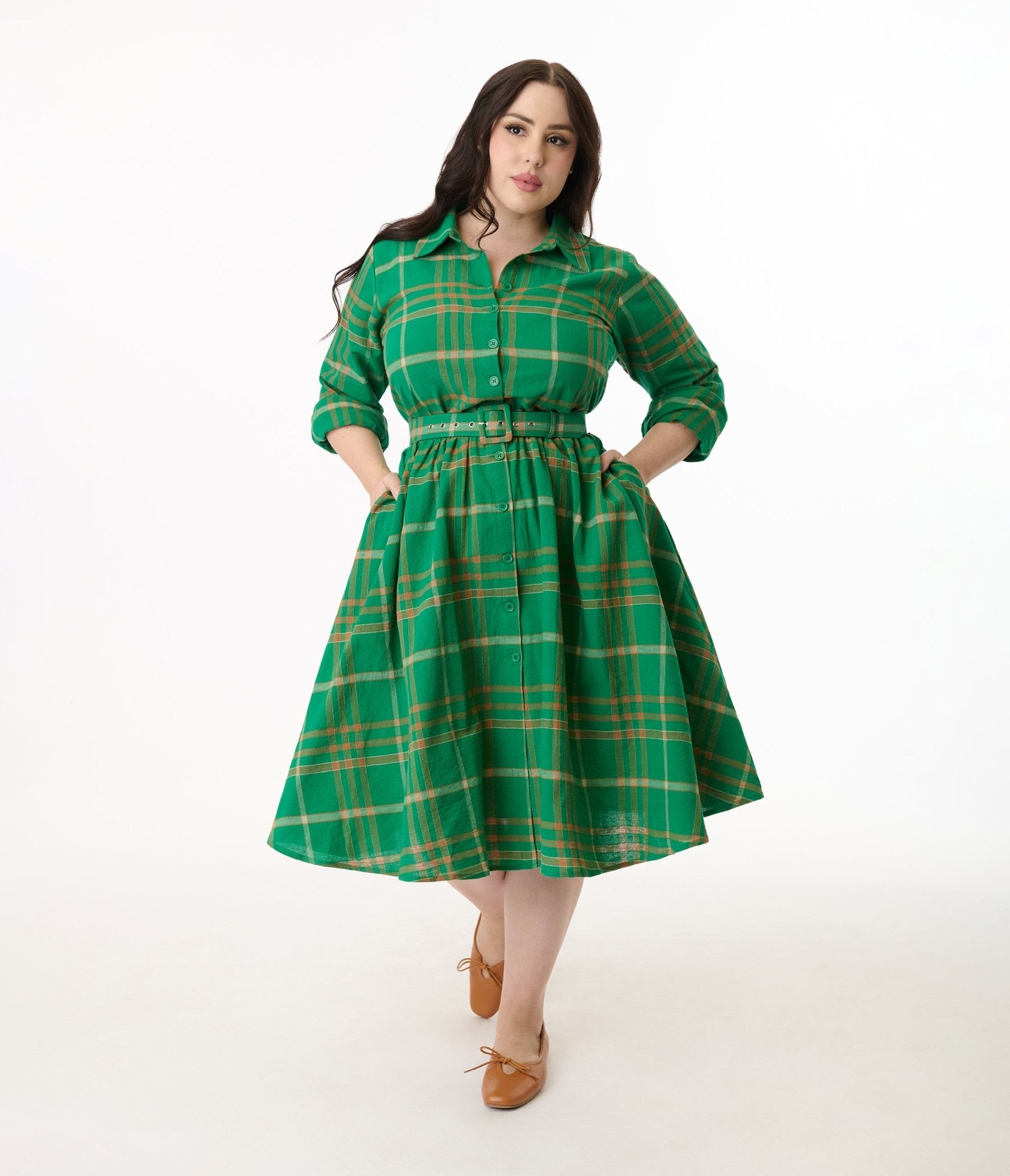Unique Vintage Plus Size Green Plaid Belted Cotton Shirt Dress